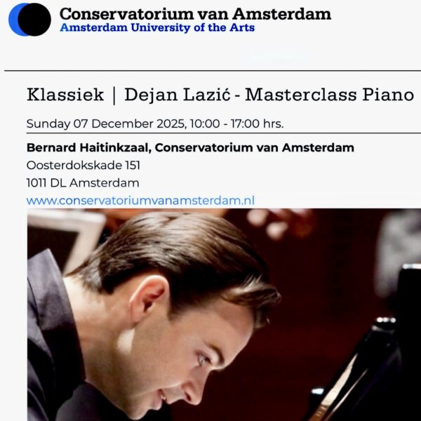 Am Sonntag, dem 7. Dezember, kehrt Dejan ans „Conservatorium van Amsterdam“ zurück, um eine Klavier-Meisterklasse zu geben. Sie beginnt um 10:00 Uhr und alle sind herzlich eingeladen, zuzuhören!