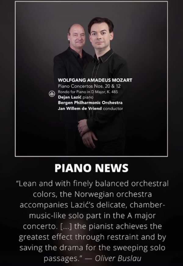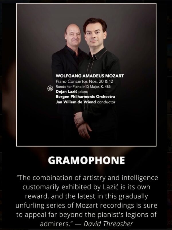 Dejans neueste Mozart-Einspielung erobert die Klassikwelt im Sturm und erntet begeisterte Kritiken für ihre Eleganz, ihre mitreißende Spielweise und ihre frische Perspektive auf die zeitlosen Meisterwerke des Meisters. Die Rezensionen zum dritten Teil der Mozart-Klavierkonzerte sind überschwänglich und heben Dejans einzigartige Fähigkeit hervor, die Kluft zwischen klassischer Tradition und modernem Ausdruck zu überbrücken. Dieses Projekt ist weit mehr als nur eine weitere Aufnahme; es ist eine zutiefst persönliche Reise für Lazić, der am Mozarteum in Salzburg studierte.